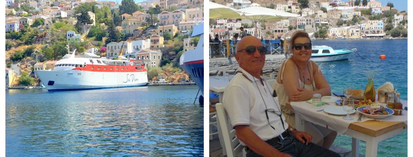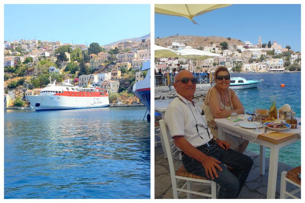Manos’ un fiyat politikasını bildiğimizden, önünde eşimin fotoğrafını çekmekle yetindik. İyi ki öyle yapmışız. Saat kulesini geçtikten sonra Symi’nin diğer koylarından biri önünde bulunan restoranda bir kişi için istediğimiz deniz ürünleri tabağı, salata ve sofra şarabına 40 Euro ödedik. Yemeğimizi yedikten sonra, limanın güney kıyısına, feribottan indiğimiz yere geri döndük.